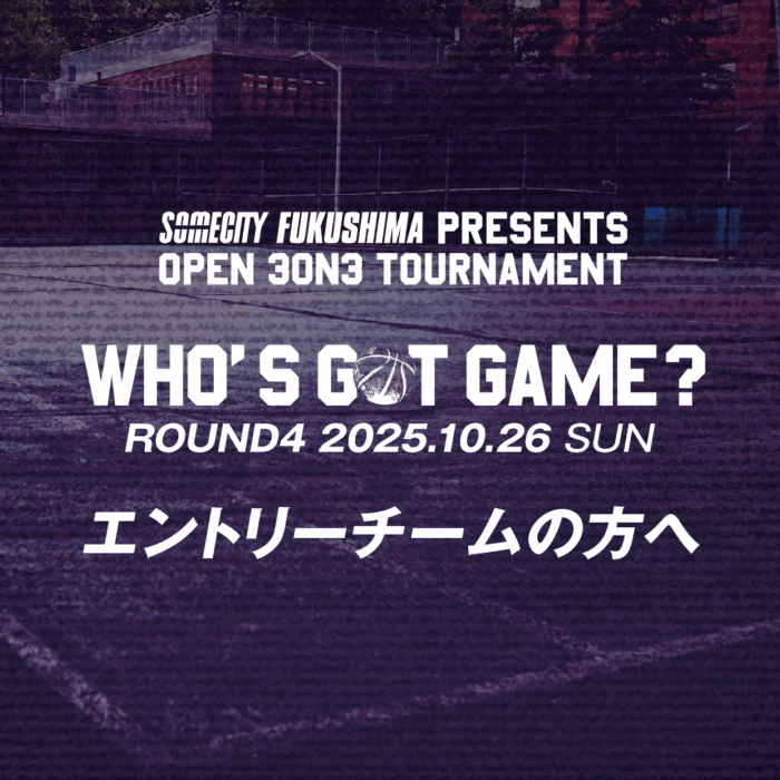 上位2チームが「SOMECITY 2024-2025 FUKUSHIMA」(決勝戦)への参加権を獲得できます。決勝戦は、予選(WHO’S GOT GAME?)参加時のメンバーで参加となりますが、1名の追加・もしくは変更は可能です。やむを得ない事情があり変更したい場合は、事務局(黒澤)までご連絡ください。